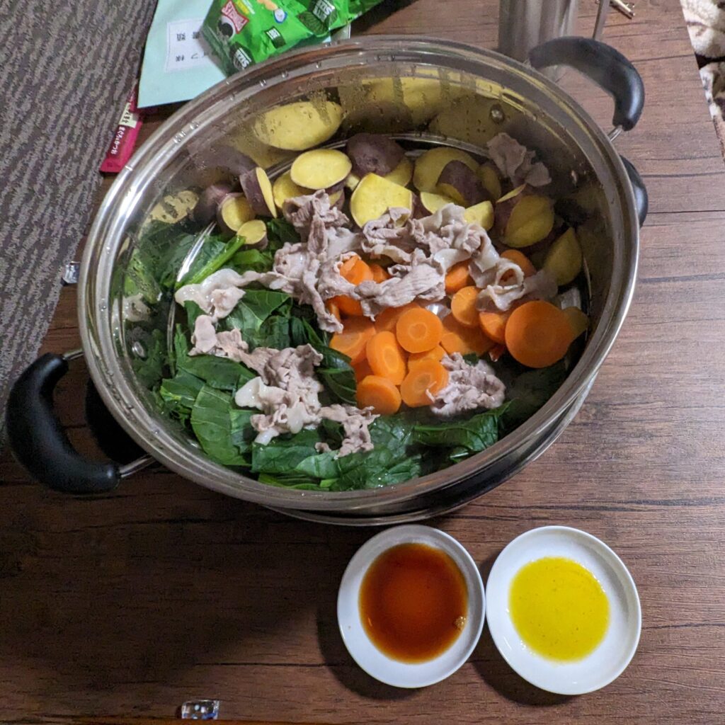 晩御飯はおひとり様蒸し野菜と豚肉でした。